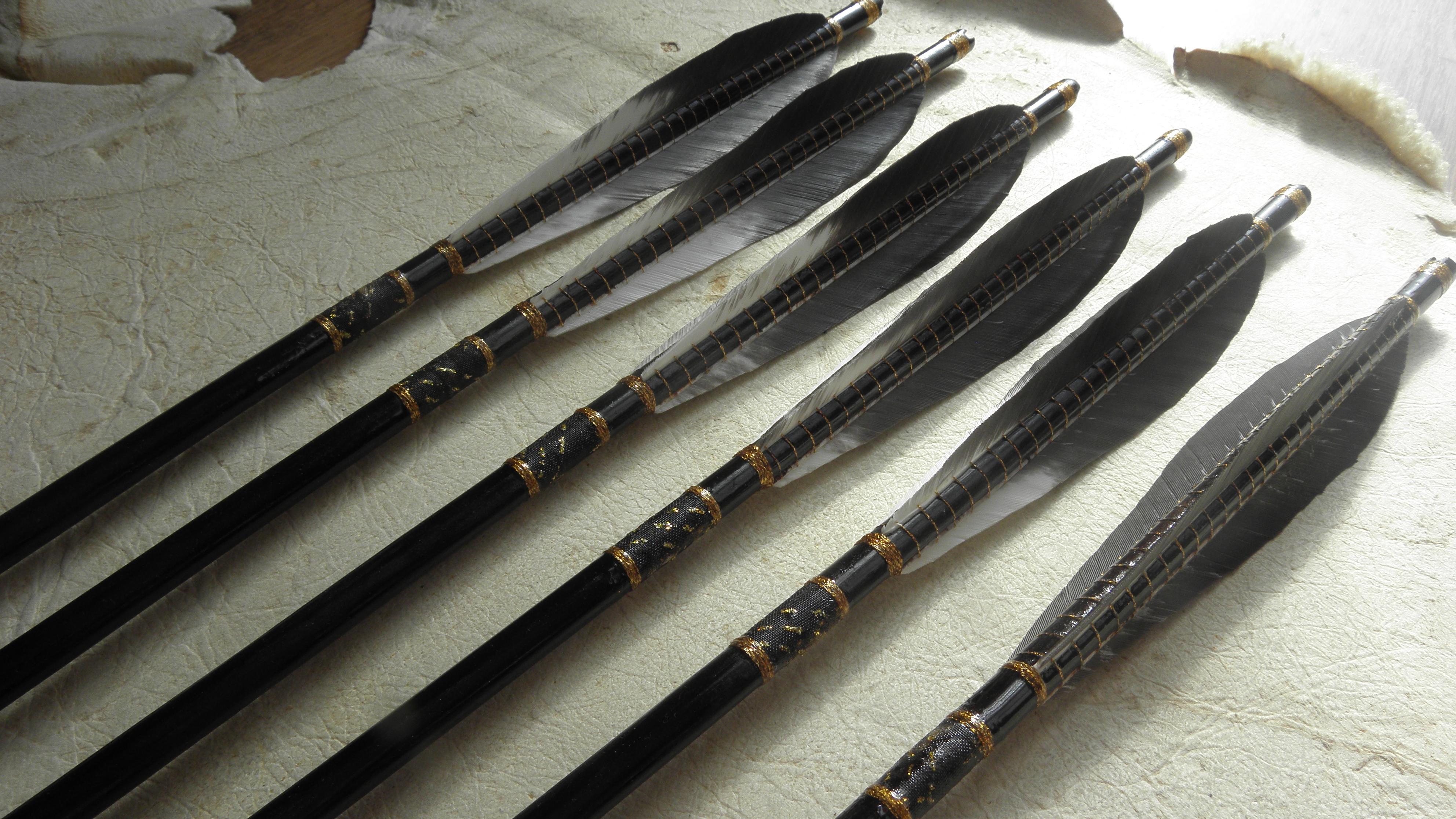 Oto moja własna interpretacja strzał wschodnich. Komplet strzał na bogato 🙂 Lotki gęsi szarej typu tureckiego długie na 15,5 cm. Promień barwiony bejcą koloru wenge. Użyłem złotej nici do oplotki i owijki. Grot wkręcany mosiężny. Całość promienia pokryta wysokiej jakości lakierem.